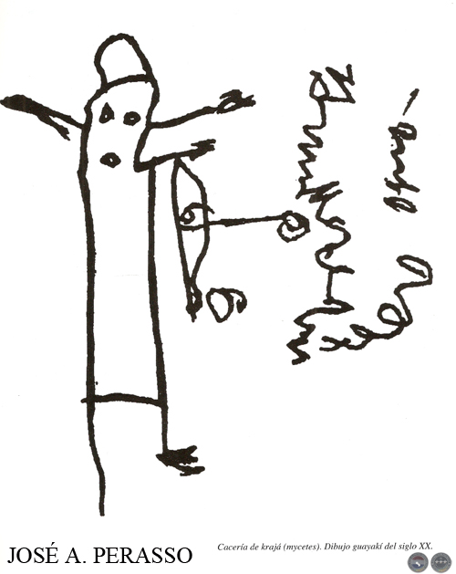 Página anterior: escena de una cacería de krajá (mycetes). Nótese el uso del aguä (bonete jerárquico) propio de los caudillos-guerreros cazadores, también la posición de los brazos y la ubicación y desproporción del arco y la flecha con respecto al sujeto. La cuerda del arco aparece estirada y la flecha adherida al centro de la cuerda a punto de ser disparada. La bestia krajá representa un blanco fijo y seguro para el cazador y se define en este caso por una serie de líneas mixtas agrupadas que resaltan por su magnitud con relación a las armas y al mismo cazador.