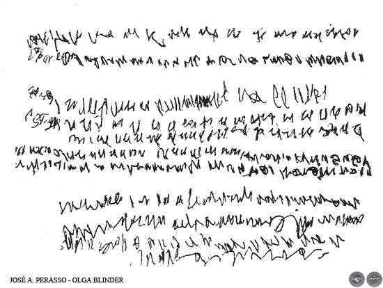En la imitación de la escritura realizada por un adulto colonizado (a-c) vemos repetidas las líneas citadas anteriormente que el niño selvático (n-s) elabora cuando alcanza un mayor dominio muscular, con la diferencia de que el niño le da un valor simbólico al nombrarlas y el adulto colonizado (a-c) sólo intenta imitar algo que pertenece ya a la cultura colonizadora en un afán, probablemente, de confundirse con el Berú.