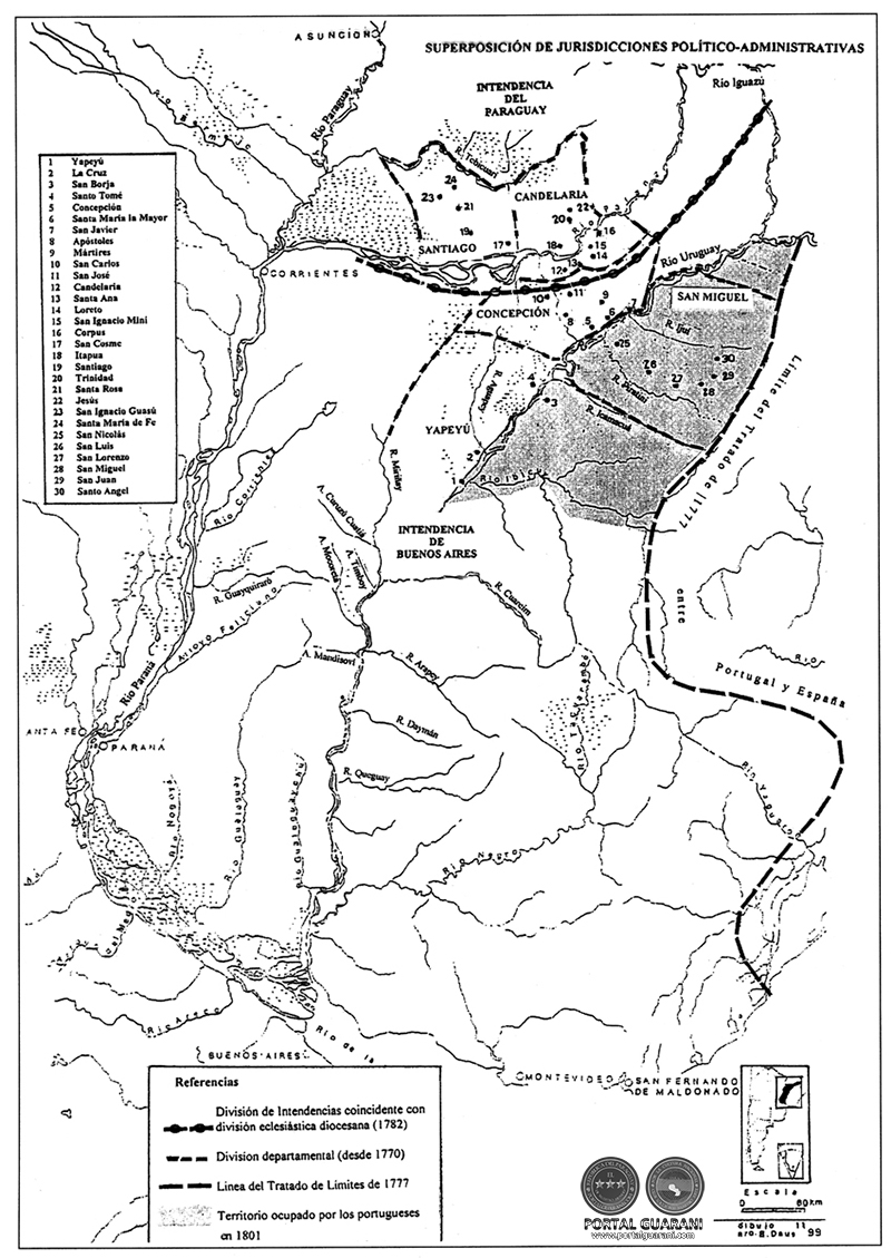 21. Desde años antes de la llegada de Belgrano, el distrito guaraní se encontraba dividido desde un punto de vista político-administrativo en tres realidades bastante diferenciadas, correspondientes a las influencias de Asunción, Buenos Aires y Portugal. La permanente inestabilidad de las fronteras establecidas por las autoridades porteñas, paraguayas y portuguesas, convertían al distrito misionero en un escenario propicio para la circulación de gente y de información que no poseían referencias estatales claramente definidas.
