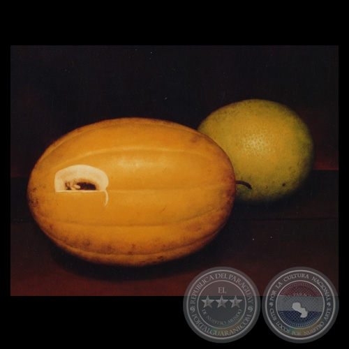 What was already present in he first works of him that l saw in Paris, some three years ago, these pomegranates ready to burst into seed, those enormous, satisfying grapefruit, as surfeited prevaricators in dreams (or nightmares, perchance?) of Botero, those apple in silent dialog ue with a guitar lacking a virtuoso, now achieve a sublime force, as if more sure of thems elves and more dominant that the artist from Concepcion now presents us at the Belmarco Gallery from Nane Beta Guasu Pora, (Asuncion, in the guarani language). This time, drawing advantage from the much larger dimensions of his paintings, like a general finding his own greatness in the enormity of great battles which give a quicker breath to his "painting mad ness", Sebastian Diaz makes us taste with our eyes moonlike melons whose missing quarter seems to have been launched to the end of space, fat mangoes gazing from their own place in the paintings as if from the balcony of royalty, humble grapefruit bent down to earth by their perceptible overload, and he dares — at last- to venture into a springless leap from vegetal to aquatic life. Keeping faith in his thirst for still life, he probes the appointed path of pictorial aegis followed, before him,