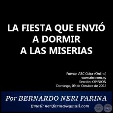 LA FIESTA QUE ENVIÓ A DORMIR A LAS MISERIAS - Por BERNARDO NERI ...
