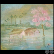 PAISAJE CON RANCHO - Óleo de LEONOR CECOTTO - Año 1986