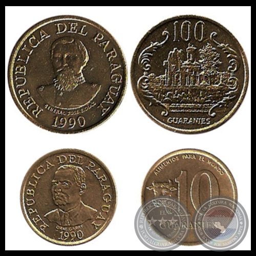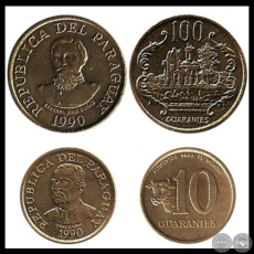 1990 - 10 y 100 GUARANÍES - ACUÑADAS EN LA ROYAL MINT - INGLATERRA - METAL: COBRE - ZINC - NIQUEL / BRONZE (DESMONETIZADAS EN 2011)