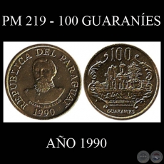 PM 219 - 100 GUARANÍES – Motivo: GENERAL JOSÉ E. DÍAZ (Anverso)/ RUINAS DE HUMAITA - GUERRA 1864 - 1870 (Reverso). Tamaño: 24,00 mm.