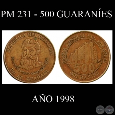 PM 231 - 500 GUARANÍES – AÑO 1997 - RESOLUCIÓN 1997 - Motivo: GENERAL BERNARDINO CABALLERO (Anverso) / EDIFICIO DEL BANCO CENTRAL DEL PARAGUAY - CON VALOR NUMÉRICO 500, (Reverso). Tamaño: 27,00 mm.