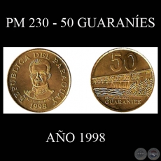 PM 230 - 50 GUARANÍES – AÑO 1998 - RESOLUCIÓN 1997 - Motivo: MARISCAL JOSÉ FÉLIX ESTIGARRIBIA (Anverso)/ REPRESA ACARAY (Reverso). Tamaño: 22,00 mm.