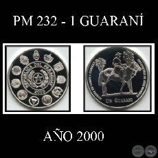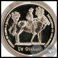 PM 232 – 1 GUARANÍ – AÑO 2000 - Motivo: IV SERIE IBEROAMERICANA, "ENCUENTRO DE DOS MUNDOS" / "HOMBRE DE CAMPO A CABALLO" (ANVERSO). Metal: Plata/ Silver.