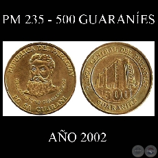 PM 235 - 500 GUARANÍES – Motivo: GENERAL BERNARDINO CABALLERO (Anverso) / EDIFICIO DEL BANCO CENTRAL DEL PARAGUAY - CON VALOR NUMÉRICO 500, (Reverso). Tamaño: 27,00 mm.