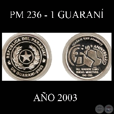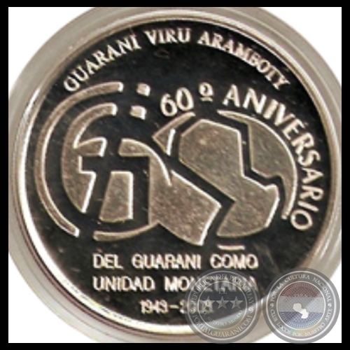 Por motivo del 60° Aniversario de la creación del GUARANI como Unidad Monetaria, la autoridad monetaria ha encargado la acuñación de una moneda conmemorativa, cuya emisión limitada, se realiza durante el año 2003. Esta moneda presenta en el anverso la figura del escudo nacional junto con la denominación de 1 guaraní, y en el reverso un motivo alegórico a los 60 años del Guaraní como Unidad Monetaria, donde la G con la barra cruzada representa el número seis (6) y el mapa del Paraguay dentro del círculo, el cero (0).