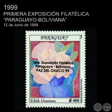 PRIMERA EXPOSICIÓN FILATÉLICA PARAGUAYO - BOLIVIANA "PAZ DEL CHACO 1999" – RESELLADA SOBRE SELLO DE 400 GUARANÍES, REPRODUCCIÓN DE OBRA DE EDITH JIMÉNEZ, DE LA SERIE PINTURAS CONTEMPORÁNEAS, 1998: 400 GUARANÍES