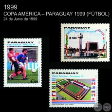 FÚTBOL : COPA AMÉRICA PARAGUAY 1999/ CARLOS HUMBERTO PAREDES, EDIFICIO DE LA CONFEDERACIÓN SUDAMERICANA DE FÚTBOL (C.S.F.) y ESTADIO FELICIANO CÁCERES, CIUDAD DE LUQUE - PARAGUAY : 300 - 500 - 1.900 GUARANÍES