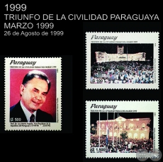 TRIUNFO DE LA CIVILIDAD PARAGUAYA - MARZO 1.999/ PROF. DR. LUIS MARÍA ARGAÑA, VICEPRESIDENTE DE LA REPÚBLICA DEL PARAGUAY (15-VIII-1998 – 23-III-1999) – IMAGEN DE LA MANIFESTACIÓN FRENTE AL PALACIO DE GOBIERNO Y LA SEDE DEL CONGRESO NACIONAL : 100 - 500 - 1.500 GUARANÍES