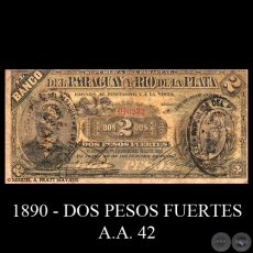 A.A. 42 - DOS PESOS FUERTES (1889) - FIRMAS: JOSÉ URDAPILLETA - FRANCISCO GUANES - P. JORBA