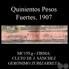 MC159.g – QUINIENTOS PESOS FUERTES – FIRMAS: CLETO DE J. SÁNCHEZ y GERÓNIMO ZUBIZARRETA