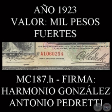 MC187.h – MIL PESOS FUERTES – FIRMAS: HARMONIO GONZÁLEZ y ANTONIO PEDRETTI