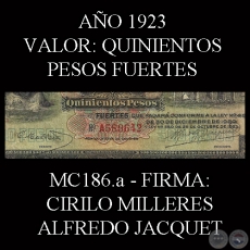 MC186.a – QUINIENTOS PESOS FUERTES – FIRMAS: CIRILO MILLERES y ALFREDO JACQUET