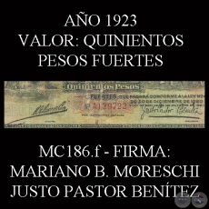 MC186.f – QUINIENTOS PESOS FUERTES – FIRMAS: MARIANO B. MORESCHI y JUSTO PASTOR BENÍTEZ