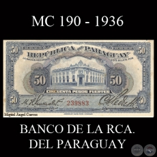 MC.190 – CINCUENTA PESOS FUERTES – FIRMAS: HARMONIO GONZÁLEZ y CARLOS PEDRETTI – REVERSO: ESCUDO CON ESTRELLA EN ROJO