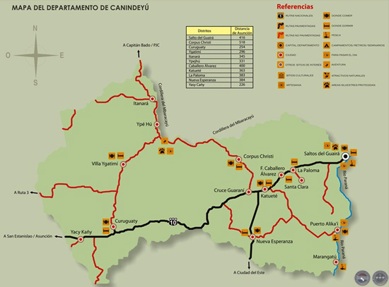 AÉREA: hay un aeropuerto en Salto del Guairá, con buena infraestructura, pero sin vuelos regulares. Otras ciudades y establecimientos agropecuarios cuentan con pistas de aterrizaje.