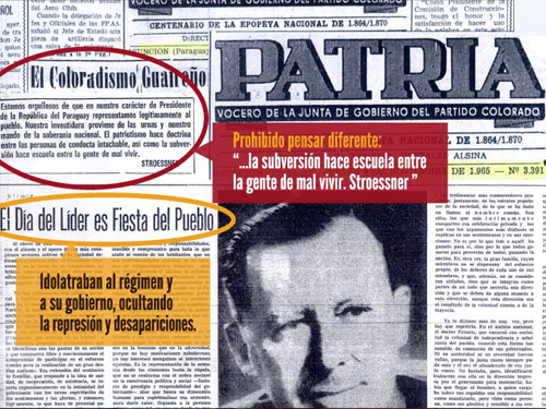 La propaganda stronista también emitió Patria, el diario impreso oficial del Partido Colorado. A través de sus páginas informaba al pueblo sobre las actividades de toda índole del Gobierno y justificaba las represiones. El costo de los ejemplares era descontado del sueldo de los funcionarios públicos que estaban obligados a adquirirlos.