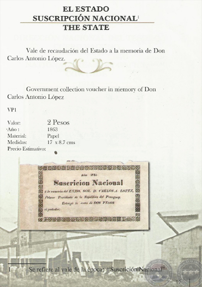 Fuente: FICHAS, VALES Y TOKENS DE LA REPÚBLICA DEL PARAGUAY 1863 - 2000. Editor: MIGUEL ANGEL PRATT MAYANS, Año 2009. NUMISMATICA INDEPENDENCIA S.A., Espacio web: www.nisa.com.py/ Contacto: nisa@pla.net.py