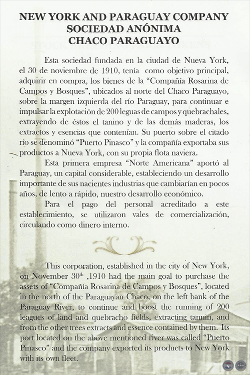 Esta sociedad fundada en la ciudad de Nueva York, el 30 de noviembre de 1910, tenía como objetivo principal, adquirir en compra, los bienes de la "COMPAÑÍA ROSARINA DE CAMPOS Y BOSQUES", ubicados al norte del Chaco Paraguayo, sobre la margen izquierda del río Paraguay, para continuar e impulsar la explotación de 200 leguas de campos y quebrachales, extrayendo de éstos el tanino y de las demás maderas, los extractos y esencias que contenían. Su puerto sobre el citado río se denominó "PUERTO PINASCO" y la compañía exportaba sus productos a Nueva York, con su propia flota naviera.