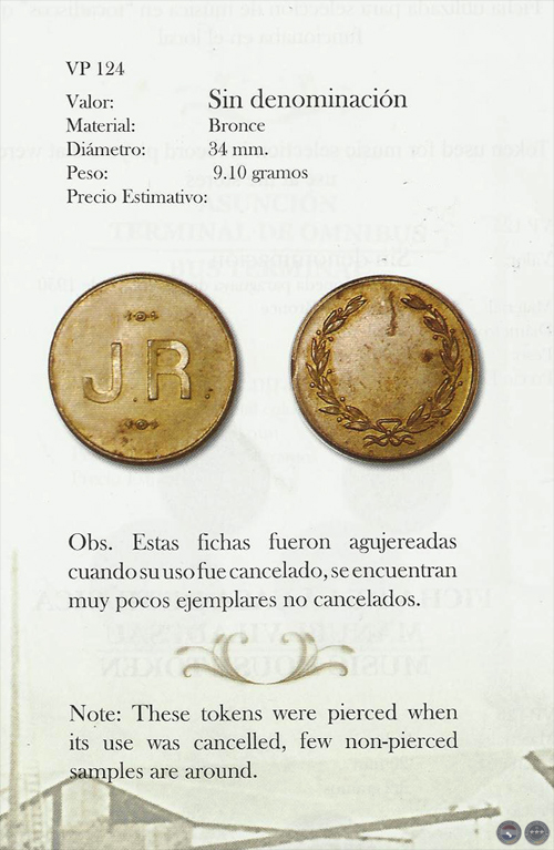 Fuente: FICHAS, VALES Y TOKENS DE LA REPÚBLICA DEL PARAGUAY 1863 - 2000. Editor: MIGUEL ANGEL PRATT MAYANS, Año 2009. NUMISMATICA INDEPENDENCIA S.A., Espacio web: www.nisa.com.py / Contacto: nisa@pla.net.py