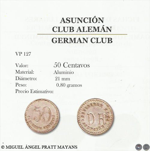 Fuente: FICHAS, VALES Y TOKENS DE LA REPÚBLICA DEL PARAGUAY 1863 - 2000. Editor: MIGUEL ANGEL PRATT MAYANS, Año 2009. NUMISMATICA INDEPENDENCIA S.A., Espacio web: www.nisa.com.py / Contacto: nisa@pla.net.py