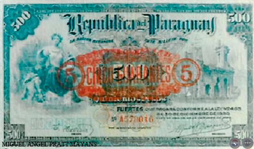 CINCO GUARANÍES/ QUINIENTOS PESOS FUERTES
