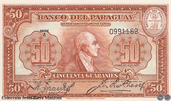 El Banco de la República del Paraguay (actualmente Banco Central del Paraguay) con acuerdo del Ministerio de Hacienda, determinó los materiales, diseño, leyendas y demás características de los billetes y monedas.