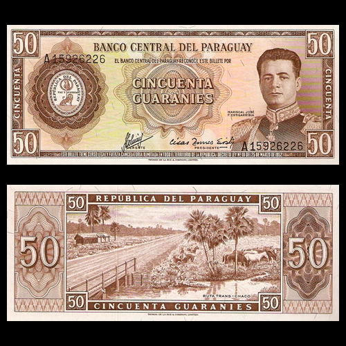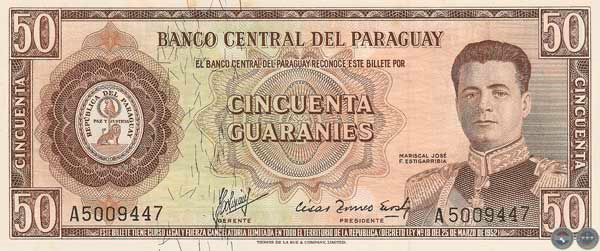 . El 5 de octubre de 1943, con el Decreto Ley Nº 655, se estableció el RÉGIMEN MONETARIO ORGÁNICO DE LA REPÚBLICA DEL PARAGUAY. Se instituyo el nombre GUARANÍ para la unidad monetaria creada, siendo dividido en 100 partes iguales, denominados céntimos y su símbolo: la letra G cruzada por una barra.