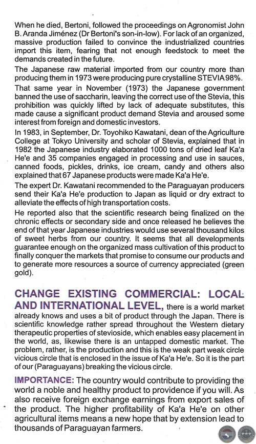 Cuando murió Bertoni, siguió los trabajos el Agrónomo Juan B. Aranda Jiménez (yerno del Dr. Bertoni). Por falta de una Producción masiva y organizada no convencieron a los países industrializados importar este rubro, por temor de que no haya suficiente materia prima, para satisfacer las demandas a crearse en el futuro.