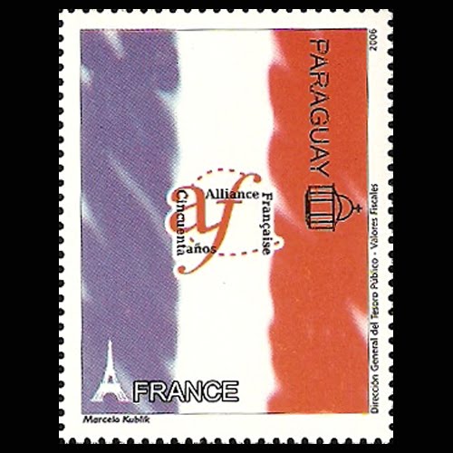 ** La viñeta sin valor facial de Marcelo Kublik juega con los colores de las banderas francesa y paraguaya (rojo, blanco y azul) cuyas franjas son verticales en una y horizontales en otra.