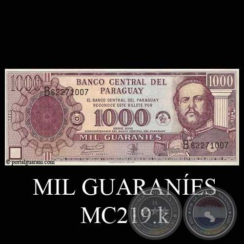 Los billetes de 1.000.-de la Serie “B” están confeccionados en papel de algodón al cien por cien (100%), nuevo y limpio y presentan similares características al de los billetes de la Serie “A”, en el Anverso como motivo principal se destaca el retrato del Mariscal Francisco Solano López, Héroe Nacional, situado al lado derecho. En la parte superior, y al centro, va él titulo “BANCO CENTRAL DEL PARAGUAY”, en dos líneas. En el ángulo superior izquierdo y derecho puede verse el valor “1000”, en caracteres y colores diferentes. A ambos lados y en sentido vertical puede leerse “MIL”. En la parte central se destaca el guarismo “1000”, a ambos lados van los escudos Nacionales, más abajo dentro de un recuadro puede leerse el valor del billete “MIL GUARANIES”, e inmediatamente debajo esta el año de impresión, posteriormente la leyenda “Cincuentenario del Banco Central del Paraguay” En el anverso, en el ángulo inferior izquierdo se encuentra ubicada la marca para invidentes, además en la parte inferior están las leyendas “Presidente”, a la derecha y “Gerente General” a la izquierda, arriba y en color violeta, los facsímiles correspondientes. El diseño del reverso del billete no sufrió variaciones.