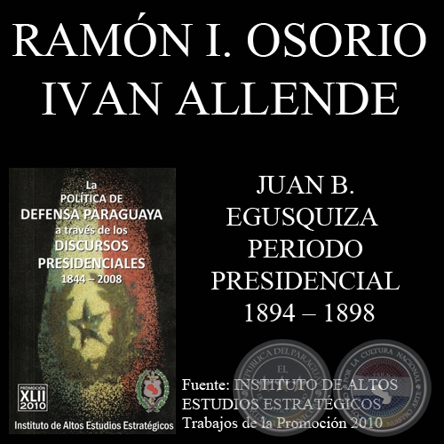 Fuente: INSTITUTO DE ALTOS ESTUDIOS ESTRATEGICOS. LA POLÍTICA DE DEFENSA PARAGUAYA A TRAVÉS DE LOS DISCURSOS PRESIDENCIALES (1844-2008). TRABAJO COLECTIVO DE LA PROMOCIÓN. GRAL. BRIG. HUGO MENDOZA . Director General , Asunción - Paraguay 2010 (198 páginas)