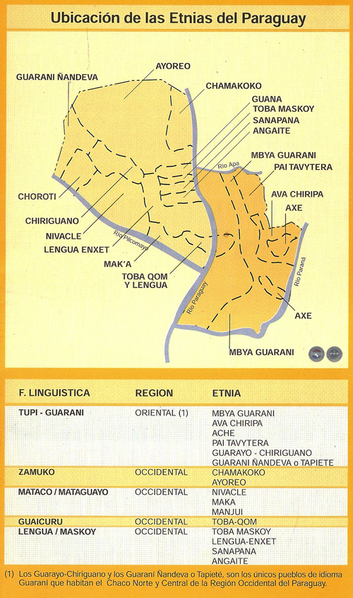 Históricamente el actual territorio nacional estuvo poblado por grupos humanos que habitaban las regiones Occidental y Oriental del país. La demografía indígena actual, según los resultados del Segundo Censo Nacional Indígena 2002, que alude a población empadronada, asciende a 87.099 personas, representado el 1,7 % de la población total del país. La distribución espacial señala que en la Región Oriental residen 44.135 personas y en la Región Occidental 42.964. Las categorías lingüísticas y el lugar en que tradicionalmente habitan constituyen los dos grandes campos del abordaje e identificación de estos pueblos. A propósito de la lengua, cinco son los principales troncos lingüísticos actualmente reconocidos en el Paraguay: