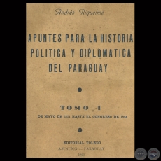 4.- APUNTES PARA LA HISTORIA POLÍTICA Y DIPLOMÁTICA DEL PARAGUAY – TOMO II - DE MAYO DE 1811 HASTA EL CONGRESO DE 1844. Por ANDRÉS RIQUELME. Editorial TOLEDO. Asunción – Paraguay, 1960 (144 páginas)