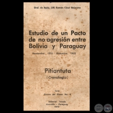 6.- ESTUDIO DE UN PACTO DE NO AGRESIÓN ENTRE BOLIVIA Y PARAGUAY. Noviembre 1931 – Diciembre 1932 - PITIANTUTA (CRONOLOGÍA). GRAL. BGDA. (SR) RAMÓN CÉSAR BEJARANO. Serie GUERRA DEL CHACO Nº 6. Editorial TOLEDO. Asunción – Paraguay, 1974 (55 páginas)