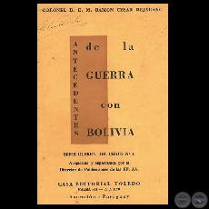 1.- ANTECEDENTES DE LA GUERRA CON BOLIVIA. CORONEL D.E.M. RAMÓN CÉSAR BEJARANO. Serie Guerra del Chaco Nº 1. Auspiciada y supervisada por la Dirección de Publicaciones de las FF.AA.. Casa Editorial Toledo, Asunción-Paraguay , 1959