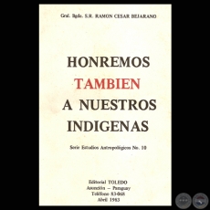 10.- HONREMOS TAMBIEN A NUESTROS INDÍGENAS. GRAL. BGDA. S.R. RAMÓN CESAR BEJARANO. Serie Estudios Antropológicos Nº 10. Editorial TOLEDO. Asunción – Paraguay. Abril 1983