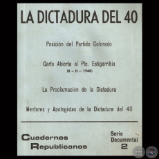 En 1939 el Gobierno provisorio presidido por el Dr. Félix Paiva convocó a elecciones de las que únicamente participó el Partido Liberal. Los partidos de oposición, Colorado y Febrerista, no pudieron presentarse a la lucha comicial por estar su prensa amordazada, sus cuadros dirigentes desterrados, presos o confinados y sus organizaciones partidarias literalmente desmanteladas por una enérgica y sistemática acción represiva. En este contexto histórico el General José F. Estigarribia, candidatado por el Partido Liberal, asumió la Presidencia Constitucional, el 15 de agosto de 1939. Más, seis meses después, tras una insólita "autodisolución" del Congreso Nacional, el Presidente Estigarribia propició el 18 de febrero de 1940 un golpe de estado que instauró la DICTADURA en nuestro país.
