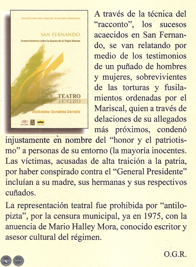 La obra San Fernando, drama histórico sobre la guerra de la Triple Alianza, es la tercera obra de una trilogía, compuesta por Procesados del 70 y Elisa (Madama Lynch).