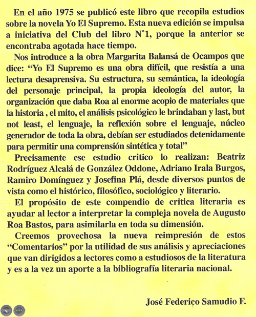 Nuestro único mérito sea tal vez abrir un primer camino para los lectores y críticos, presentando esta edición. Deseamos que ayude a los unos a internarse en la alta selva de “Yo El Supremo”, contestando interrogantes y aclarando dudas, y a los otros a estudiar la obra de nuestro más ilustre escritor nacional.